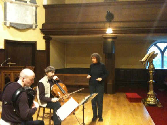 In musical terms, Gubaidulina is very much a child of the 1960s, a woman who pushes the envelope of instrumental possibility in consistently intriguing ways. Take for example the most recent work heard on Saturday, Repentance (2008) for cello (Ivan Monighetti), three guitars (members of the Dublin Guitar Quartet) and double bass (Malachy Robinson).